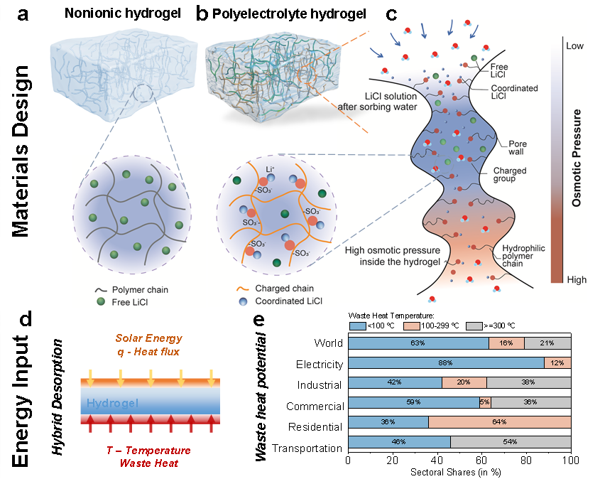 近日,上海交通大學(xué)王如竹教授領(lǐng)銜的“能源-水-空氣” 交叉學(xué)科創(chuàng)新團隊ITEWA(Innovative Team for Energy, Water & Air)與新加坡國立大學(xué)Tan Swee Ching教授合作在Advanced Materials期刊發(fā)表名為All-day Multicyclic Atmospheric Water Harvesting Enabled by Polyelectrolyte Hydrogel with Hybrid Desorption Mode的研究論文。論文開發(fā)了新一代聚電解質(zhì)凝膠復(fù)合吸附劑實現(xiàn)快速的吸附特性,并結(jié)合余熱及太陽能混合解吸策略實現(xiàn)快速水釋放。為了盡可能快速的吸附-解吸循環(huán)特性,優(yōu)化了系統(tǒng)內(nèi)傳熱傳質(zhì)特征以及全天循環(huán)策略,實現(xiàn)了取水量的倍增以及全天候的空氣取水,為下一代空氣取水材料開發(fā)、系統(tǒng)優(yōu)化提供新的見解。論文的作者為上海交通大學(xué)制冷與低溫研究所、新加坡國立大學(xué)材料系聯(lián)合培養(yǎng)博士生山訸,通訊作者為王如竹教授和Tan Swee Ching教授。