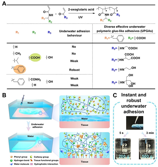 具有濕粘接能力的高分子粘接劑在快速傷口閉合、緊急止血、可植入電子設(shè)備等生物醫(yī)學(xué)領(lǐng)域具有廣闊的應(yīng)用前景。然而,目前報導(dǎo)的大部分粘接劑對動態(tài)生物組織的濕粘接強(qiáng)度相對較弱,其主要原因是界面水合層的存在干擾了粘接劑和目標(biāo)基質(zhì)表面之間的直接接觸和化學(xué)鍵合。另一方面,粘接劑的內(nèi)聚強(qiáng)度也具有重要影響,尤其在水下環(huán)境中,由于水分子的滲透作用,粘接劑會發(fā)生溶脹或降解,機(jī)械強(qiáng)度顯著降低,基體往往先于粘接界面被破壞。因此,如何通過分子結(jié)構(gòu)的精確調(diào)控以實(shí)現(xiàn)高分子粘接劑界面作用力和內(nèi)聚強(qiáng)度的協(xié)同提升是亟需解決的關(guān)鍵科學(xué)問題。