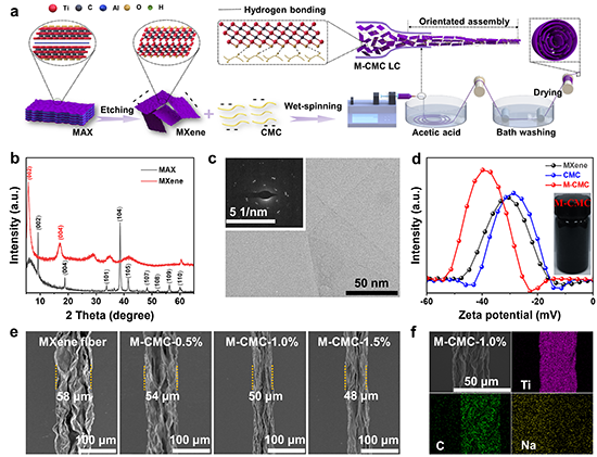 圖2對濕法紡絲制備的MXene復合纖維進行了表征,證實了CMC在MXene復合纖維中發(fā)揮間隔劑和連接劑的作用。