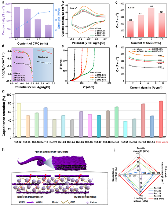 圖4對濕法紡絲制備的MXene復合纖維電化學動力學進行測試,證明M-CMC-1%復合纖維具有最快的離子傳遞速度。