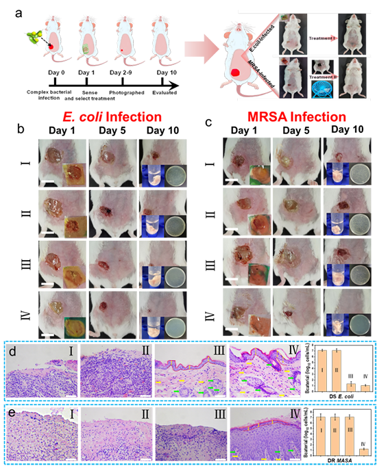 該成果以“A “Test-to-Treat” Pad for Real-Time Visual Monitoring of Bacterial Infection and On-Site Performing Smart Therapy Strategies”為題發(fā)表于《ACS Nano》上。文章第一作者為博士生趙晨曦,通訊作者為東北大學宋焱焱教授和丁辰教授。