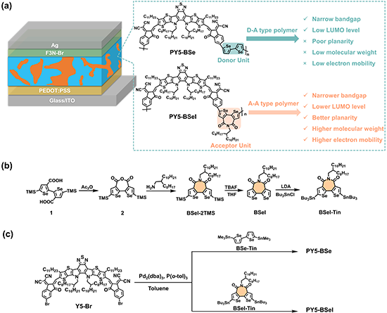 圖1.(a)all-PSCs中的聚合物受體化學(xué)結(jié)構(gòu)和器件結(jié)構(gòu)示意圖;(b)錫化單體BSeI-Tin和(c)聚合物受體的合成路線圖。