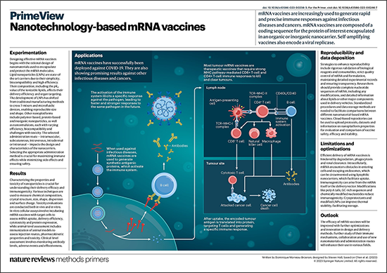 隨后,作者回顧了mRNA疫苗在預(yù)防和治療感染性疾。包括新型冠狀病毒)、癌癥和其他疾病中的創(chuàng)新應(yīng)用(圖3和圖4)。緊接著作者對(duì)提高mRNA疫苗研究數(shù)據(jù)的可重復(fù)性和數(shù)據(jù)存儲(chǔ)方式提出了一些策略和建議。盡管 mRNA 疫苗被廣泛認(rèn)為是一種有前景的預(yù)防和治療方法,但現(xiàn)有的 mRNA 疫苗仍然面臨許多限制,包括細(xì)胞內(nèi)和細(xì)胞外屏障、免疫原性和安全性等問(wèn)題。最后,作者總結(jié)并展望了基于納米平臺(tái)的mRNA疫苗在未來(lái)十年中所面臨的挑戰(zhàn)和發(fā)展前景。Nature Reviews Methods Primers編輯部也于期刊同期發(fā)表了PrimeView類型的觀點(diǎn)論文,并對(duì)該論文進(jìn)行了高度總結(jié)和推介(圖5)。
