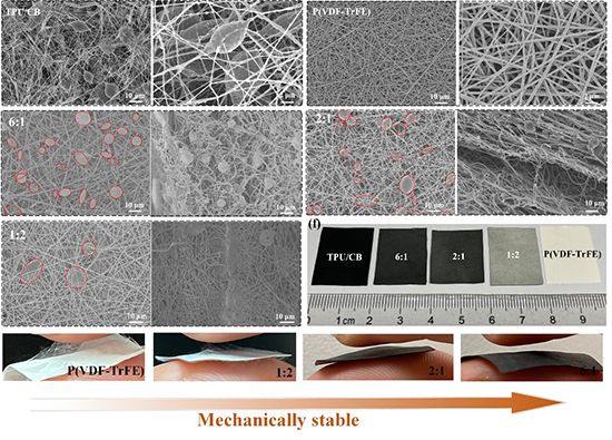 為了克服傳統(tǒng)電池在可穿戴電子產(chǎn)品上的應(yīng)用限制,自供電可穿戴電子產(chǎn)品正在高速地發(fā)展。靜電紡納米纖維基的摩擦電納米發(fā)電機(jī)(TENGs)在可穿戴電子產(chǎn)品中具有廣闊的應(yīng)用前景而備受關(guān)注,其能夠提高鐵電聚合物的β相含量、優(yōu)化摩擦層中的電荷分布,使其表現(xiàn)出更高的摩擦電輸出性能。然而一些靜電紡絲納米纖維在頻繁壓縮接觸當(dāng)然過(guò)程中會(huì)產(chǎn)生分層的現(xiàn)象,這是由于纖維之間只是簡(jiǎn)單物理重疊,這限制了其在可穿戴電子產(chǎn)品中的應(yīng)用。