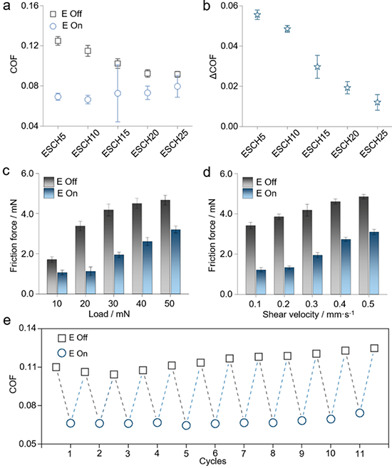 為了探究受黏膜啟發(fā)的超分子-共價水凝膠制備方法的普適性(圖5),實驗中選定的一系列電響應(yīng)聚合物,其重要特點是高分子鏈的側(cè)基是帶電基團,能夠發(fā)生電凝膠化。當(dāng)把這一類電響應(yīng)聚合物引入到水凝膠設(shè)計中,新制備的水凝膠都表現(xiàn)出電場響應(yīng)潤滑特性,從而證明了制備方法的普適性。