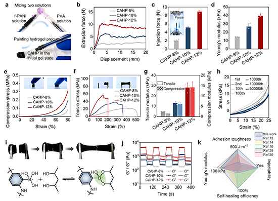 側(cè)鏈官能化賦予了導(dǎo)電聚合物協(xié)同可逆交聯(lián)的能力,使CAHP能夠在機械損傷后動態(tài)地重新排列,恢復(fù)電傳導(dǎo)的原始滲流路徑(圖4)。分離的CAHP可在接觸后迅速自主連接,抑制裂紋擴展。主要原因是動態(tài)共價硼酸酯鍵可以在不依賴外部刺激的情況下重新結(jié)合,從而產(chǎn)生強大的自愈力,快速補償材料缺陷。此外,f-PANi和PVA之間可逆的氫鍵相互作用也有助于交聯(lián)再結(jié)合。與其他自愈合導(dǎo)電聚合物水凝膠相比,f-PANi能夠直接參與網(wǎng)絡(luò)重塑,實現(xiàn)更高的機械和電自愈合效率。綜合來看,與以往不兼容剪切稀化粘度和可支撐彈性的導(dǎo)電聚合物水凝膠相比,CAHP通過整合共價鍵和非共價鍵,明顯改善了自愈合網(wǎng)絡(luò)的機械性能,在可注射性、自愈合性、粘附性和機械模量方面具有全面優(yōu)勢,有助于制造微創(chuàng)、耐用和自愈合的柔性電子器件。