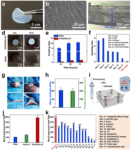 濕性粘合水凝膠一旦與濕組織接觸,就會快速形成大量氫鍵,然后形成共價(jià)鍵,從而獲得強(qiáng)粘附性。因此,濕性粘合水凝膠作為一種潛在的軟組織修復(fù)材料已被廣泛報(bào)道。然而,濕性粘合水凝膠在體內(nèi)潮濕環(huán)境中表現(xiàn)出嚴(yán)重的溶脹,粘合強(qiáng)度和機(jī)械性能隨之顯著減弱,導(dǎo)致無法滿足高爆破壓軟組織的修復(fù)要求,并易引發(fā)嚴(yán)重的術(shù)后粘連。