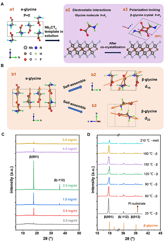 根據(jù)密度函數(shù)理論(DFT)探索的甘氨酸與Nb2CTx納米片之間的相互作用,即甘氨酸晶體可以在Nb2CTx納米片的誘導下結晶并擇優(yōu)取向。在此基礎上,本研究提出了甘氨酸結晶過程中的界面極化鎖定過程(圖3)。當甘氨酸在水溶液中與Nb2CTx納米片形成均一混合溶液時,在Nb和O原子之間的靜電相互作用的驅動下,甘氨酸分子可以有規(guī)則地排列在Nb2CTx納米片的表面上,以其最佳取向與Nb2CTx的2D晶面結合,此時甘氨酸的凈極化為 P≈P1;在共結晶過程后,甘氨酸結晶成β相甘氨酸晶體,并且它們仍然以其最佳取向與Nb2CTx納米片相互作用,形成甘氨酸與Nb2CTx納米片之間的界面極化鎖定,使甘氨酸晶體仍然保持一定的P≈P2的凈極化。為了進一步探索β相甘氨酸的穩(wěn)定性,利用原位XRD研究了Gly-Nb2C-NFs的相變性能,結果表明,在整個加熱過程中直到甘氨酸熔化溫度~210°C,β(001)、β(-112)和β(012)晶面均保持著較強的峰值強度,即Gly-Nb2C-NFs上的β相甘氨酸晶體具有優(yōu)異的熱穩(wěn)定性。