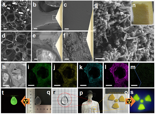 針對(duì)上述問(wèn)題和背景,河北大學(xué)張海磊副教授、楊艷民教授與根特大學(xué)Richard Hoogenboom教授等人合作,開(kāi)展了如下工作:作者將檸檬酸配體分子修飾在埃洛石納米管表面,在納米管表面原位合成鋱基X射線閃爍體,并將其粒徑控制在納米尺度。其在X射線照射的開(kāi)關(guān)切換狀態(tài)下顯示出同步放射性發(fā)光行為,具有良好的水分散性、穩(wěn)定性和低毒性,且與聚合物具體的相容性顯著改善。他們進(jìn)一步針對(duì)不同領(lǐng)域的應(yīng)用開(kāi)發(fā)了三種材料:1)具有輻射致發(fā)光特性的聚氨酯復(fù)合多孔泡沫材料;2)可用于X射線成像柔性水凝膠閃爍體屏幕,為非曲面成像系統(tǒng)的構(gòu)建提供有益嘗試;3)用于多級(jí)防偽信息加密的復(fù)合水凝膠,真實(shí)信息僅可在X射線下讀取。上述研究成功拓展了X射線閃爍體材料在柔性復(fù)合材料領(lǐng)域的應(yīng)用,也為高分子復(fù)合材料的精細(xì)化和高附加值化發(fā)展提供有力支持。