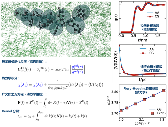 分子動力學(xué)模擬是高分子學(xué)科中研究構(gòu)效關(guān)系的重要手段,是銜接實(shí)驗(yàn)和理論的重要橋梁。然而,傳統(tǒng)全原子分子動力學(xué)模擬技術(shù)由于所能模擬的空間及時間尺度相對有限,很難滿足實(shí)際需求。粗;M技術(shù)是提升效率的主要途徑。但由于粗粒化過程中自由度的約化,缺乏對C-H鍵等底層微觀化學(xué)細(xì)節(jié)的有效考慮,所獲得的多尺度結(jié)構(gòu)及動力學(xué)等性質(zhì)與實(shí)驗(yàn)或全原子模擬相比偏差較大,只能做到半定量計(jì)算與預(yù)測,極大地限制了分子動力學(xué)模擬在解釋實(shí)驗(yàn)新現(xiàn)象、助力新材料研發(fā)等方面的潛能。因此,亟需發(fā)展化學(xué)特異性精準(zhǔn)粗;M方法,在約化體系自由度的同時,有效考慮C-H鍵等被約化自由度對體系各類性質(zhì)的影響,實(shí)現(xiàn)高分子體系不同時空尺度結(jié)構(gòu)及動力學(xué)性質(zhì)的準(zhǔn)確定量描述,這也是目前高分子理論模擬領(lǐng)域面臨的挑戰(zhàn)性難題及重要國際前沿方向。