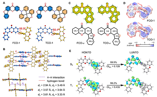 圖1. A) 分子化學(xué)結(jié)構(gòu)及晶體構(gòu)型;B) 分子晶體堆積構(gòu)型;C) AICD及NICS計(jì)算結(jié)果;D) 靜電勢(shì)分析; E) TCO-1的S1和T1態(tài)的自然躍遷軌道分析