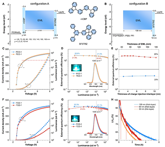 圖2. 器件結(jié)構(gòu)A)和B),能級(jí)及功能層分子結(jié)構(gòu);C) 基于結(jié)構(gòu)A的電流密度-電壓-亮度圖; D) 外量子效率-亮度圖 (x = 100, y = 10); E) 外量子效率隨功能層厚度變化曲線; F) 基于結(jié)構(gòu)B的電流密度-電壓-亮度圖; G) 外量子效率-亮度圖; H) 非摻雜TCO-1厚發(fā)光層和薄發(fā)光層器件的工作壽命對(duì)比圖; D)和G)圖中的插圖: 5V處的EL光譜和FCO-1的器件照片
