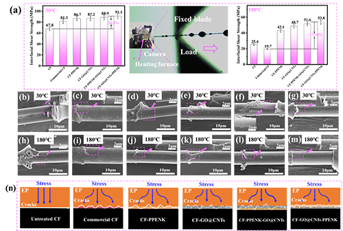 碳纖維增強環(huán)氧樹脂復(fù)合材料(CFRP)在航空航天、海洋工程和人造衛(wèi)星等領(lǐng)域廣泛應(yīng)用。然而,CF表面呈現(xiàn)微晶石墨結(jié)構(gòu)并表現(xiàn)出化學(xué)惰性,并且CF與基體之間存在較大的模量差異,導(dǎo)致界面區(qū)域內(nèi)的應(yīng)力傳遞效率較差。此外,CF/環(huán)氧樹脂復(fù)合材料通常需要在高溫條件下保持結(jié)構(gòu)完整性。然而,目前市售的CF表面施膠劑大多是環(huán)氧基聚醚基長鏈聚合物,在高溫下非常容易軟化和降解,所以無法充當(dāng)碳纖維和樹脂基體之間的橋梁,導(dǎo)致高溫條件下CF復(fù)合材料的界面粘合性能下降。因此,C復(fù)合材料的整體耐熱性主要受界面層高溫性能的制約。