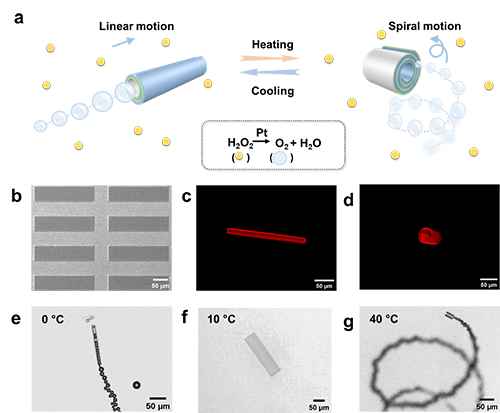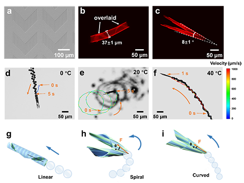 在此基礎(chǔ)上,以上述管狀結(jié)構(gòu)為結(jié)構(gòu)單元,設(shè)計(jì)更為復(fù)雜的三維結(jié)構(gòu),調(diào)節(jié)微驅(qū)動(dòng)器運(yùn)動(dòng)。通過溫度調(diào)控驅(qū)動(dòng)器管狀結(jié)構(gòu)的構(gòu)形和空間布局,調(diào)節(jié)氣泡的產(chǎn)生方式,獲得不同的矢量和推動(dòng)力,實(shí)現(xiàn)對(duì)微驅(qū)動(dòng)器運(yùn)動(dòng)的速度、軌跡、曲率等行為的有效調(diào)節(jié)(圖2)。所制備的微驅(qū)動(dòng)器尺寸在微米級(jí)、三維形貌可調(diào)控、運(yùn)動(dòng)速度快、運(yùn)動(dòng)軌跡具有響應(yīng)性等特點(diǎn),可以加速微流控體系中低雷諾數(shù)流體混合,有望應(yīng)用于小型機(jī)器人、仿生器件的制備等。且利用聚合物基等軟物質(zhì)作為主體材料,有助于開發(fā)具備靈活性和可生物降解性的微驅(qū)動(dòng)器。以上微驅(qū)動(dòng)器設(shè)計(jì)與運(yùn)動(dòng)調(diào)控為制備復(fù)雜結(jié)構(gòu)的微驅(qū)動(dòng)器提供策略,并為軟體微驅(qū)動(dòng)器應(yīng)用于藥物遞送、傳感監(jiān)測(cè)等領(lǐng)域的應(yīng)用提供理論基礎(chǔ)。