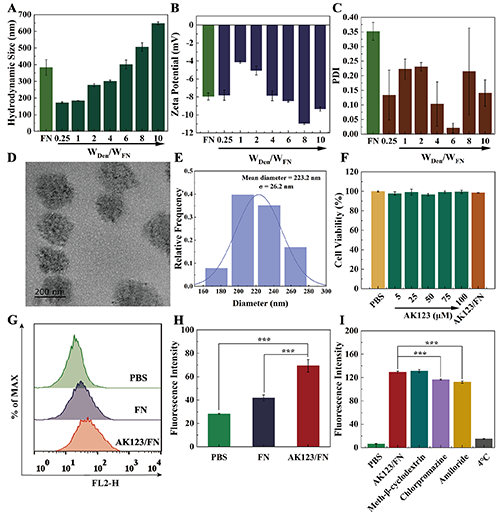 圖2.(A)FN和不同質量比下AK123/FN NCs的水動力學尺寸、(B)zeta電勢和(C)PDI。(D)AK123/FN NCs在AK123/FN質量比為4時的TEM圖像和(E)尺寸分布直方圖。(F)BV2細胞經(jīng)不同濃度AK123或AK123/FN處理24 h后的細胞活力。(G)流式細胞術直方圖和(H)BV2細胞經(jīng)PBS、FN或AK123/FN NCs處理12 h后的熒光強度定量。(I)預先處理不同抑制劑后BV2細胞對AK123/FN NCs的細胞攝取途徑評估。