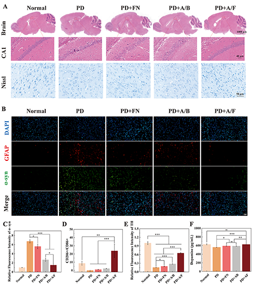 圖6.(A)腦和海馬CA1區(qū)H&E染色圖像和神經(jīng)元Nissl染色。(B)不同組小鼠紋狀體GFAP和α-syn的免疫熒光染色和(C)α-syn的相對熒光強度。(D)CD206+/CD86+相對熒光強度比值。(E)TH的相對熒光強度和(F)不同組小鼠大腦中多巴胺的相對水平。