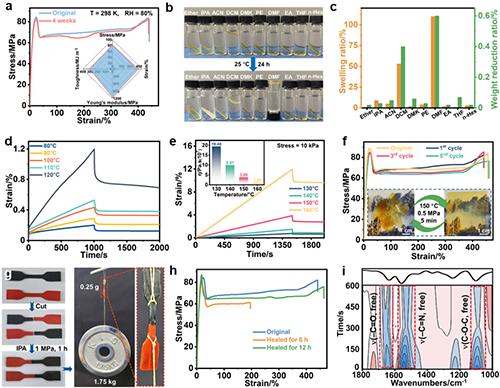 圖4(a)CSSMP-5%在高濕度條件(RH = 80%)下暴露4周前后的應(yīng)力-應(yīng)變曲線;(b)CSSMP-5%在各種溶劑中浸泡24 h前后的光學(xué)照片;(c)CSSMP-5%在各種溶劑中浸泡24 h后的溶脹率和質(zhì)量減輕率的柱狀統(tǒng)計(jì)圖;(d)CSSMP-5%在不同溫度下的蠕變恢復(fù)曲線;(e)CSSMP-5%在10 kPa的恒定應(yīng)力下,不同溫度的蠕變恢復(fù)圖以及粘度圖;(f)CSSMP-5%在不同回收次數(shù)時(shí)的應(yīng)力-應(yīng)變曲線。插圖為CSSMP-5%熱壓過(guò)程前后的光學(xué)照片;(g)0.25 g的啞鈴狀樣條在修復(fù)1 h后提拉起1.75 kg啞鈴片的光學(xué)照片;(h)原始和修復(fù)不同時(shí)間后的CSSMP-5%樣條的應(yīng)力-應(yīng)變曲線;(i)根據(jù)CSSMP-5%與IPA接觸時(shí)間(0-600 s)處理出的2DPCMW同步光譜,波數(shù)范圍為1800-1000 cm?1。圖中粉色和藍(lán)色分別代表正相關(guān)與負(fù)相關(guān)。