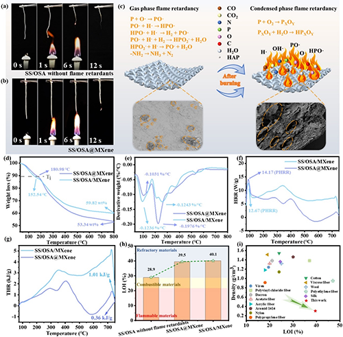 根據(jù)垂直燃燒實驗可以看出,自愈合同軸熱電纖維在離開酒精燈(~1.2 s)后可立即自熄。然而,不含聚磷酸銨和羥基磷灰石的芯鞘熱電遇到火焰時發(fā)生明顯的收縮。自愈合同軸熱電纖維具有優(yōu)異阻燃性的原因,從氣相角度來看,纖維外殼中的聚磷酸銨減少了可燃氣體的釋放。從凝聚相角度來看,纖維外殼遇熱會分解成焦炭殘渣,形成穩(wěn)定致密的焦炭,可以阻擋熱傳遞的層。此外,芯層中羥基磷灰石的殘留物形成一種有效的隔熱屏障,以減少熱量以及氣相和冷凝相之間的傳質。通過熱重分析,自愈合同軸熱電纖維在800 ℃顯示出高質量殘留含量53.34 wt%。進一步用錐形量熱儀分析評估纖維的峰值熱釋放速率達到14.17 W/g,原因是纖維由于脫水而降低了由有機物表面碳化引起的加熱和分解。同樣的結論也在LOI測試中獲得,自愈合同軸熱電纖維的LOI值為39.5%?偟膩碚f,自愈合同軸熱電纖維的輕質阻燃特性為其用作自供電高溫報警傳感器時提供了可靠的基礎。