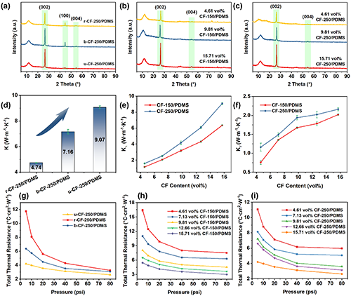 圖3 CF/PDMS復(fù)合材料的XRD譜圖、導(dǎo)熱系數(shù)和總熱阻