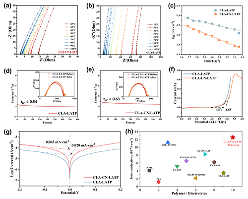 圖2 CLA-CN-LATP QCE與CLA-LATP QCE的Li+傳輸性能對(duì)比。(a) CLA-CN-LATP QCE和(b) CLA-LATP QCE在不同溫度下的阻抗圖;(c) CLA-CN-LATP QCE和CLA-LATP QCE的離子電導(dǎo)率Arrhenius擬合圖;(d) Li|CLA-CN-LATP QCE|Li電池和(e) Li|CLA-LATP QCE|Li電池的極化曲線及初始和穩(wěn)態(tài)阻抗圖;(f) CLA-CN-LATP QCE和CLA-LATP QCE的LSV測(cè)試曲線;(g) Li|CLA-CN-LATP QCE|Li電池和Li|CLA-LATP QCE|Li電池的Tafel圖;(h) CLA-CN-LATP QCE與其他材料的離子電導(dǎo)率對(duì)比圖。