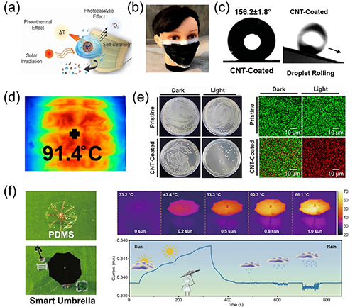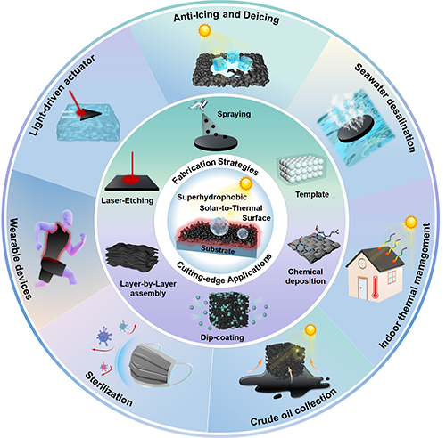 超疏水光熱材料(SSTMs)具有協(xié)同拒水性和光熱轉(zhuǎn)換的特性,在抗冰除冰、海水淡化、原油收集、光驅(qū)動執(zhí)行器、熱量管理以及生物醫(yī)用領(lǐng)域具有廣闊的應(yīng)用前景。SSTMs的典型優(yōu)點是即使在水的環(huán)境下仍能實現(xiàn)穩(wěn)定的光熱轉(zhuǎn)換和持續(xù)的熱能供應(yīng),從而提高能源利用效率。盡管一系列超疏水光熱材料被研究和報導(dǎo),但其工作機制、制備策略及前沿應(yīng)用尚未進行系統(tǒng)的總結(jié)和探討。