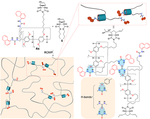 輪烷是一種獨特的機(jī)械互鎖結(jié)構(gòu),其構(gòu)筑成分間能夠發(fā)生滑動或者轉(zhuǎn)動等相對運動。這種機(jī)械互鎖的動態(tài)本質(zhì)能夠耗散能量,將其引入到聚合物中能夠展示許多優(yōu)異的特性,例如拉伸性、刺激響應(yīng)性和自愈合性能等。盡管已經(jīng)報道過許多基于環(huán)糊精、冠醚、葫蘆脲等超分子大環(huán)體系的輪烷聚合物,然而單一的依靠相應(yīng)的主客體作用形成的機(jī)械互鎖結(jié)構(gòu)無法賦予聚合物較高的強度。如何協(xié)同其他超分子作用來構(gòu)筑高強度的輪烷聚合物具有非常重要的研究意義。