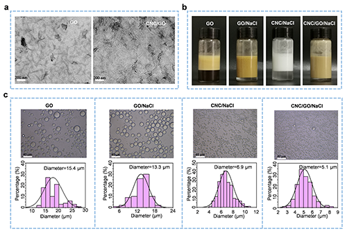 圖2. (a) GO 和 CNC/GO 的 TEM 圖像。(b) 不同乳化劑體系(分別為 GO、GO/NaCl、CNC/NaCl 和 CNC/GO/NaCl)穩(wěn)定的 C18 Pickering 乳液靜置 24 小時(shí)后的照片。(c) 分別用 GO、GO/NaCl、CNC/NaCl 和 CNC/GO/NaCl 乳化的 C18 Pickering 的 POM 圖像和相應(yīng)的粒徑分布。水相中 GO、NaCl 和 CNC 的濃度分別為 0.3 wt.%。