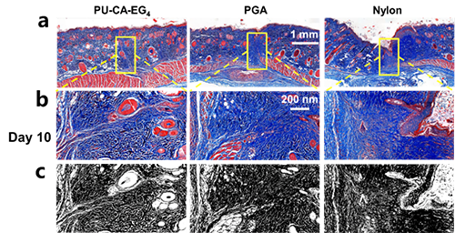 圖4. 膽酸基聚氨酯樣品縫合大鼠傷口后經(jīng)紅外刺激響應(yīng)的自收緊過(guò)程,(b) 分別使用膽酸基聚氨酯樣品、聚乙二醇酸和尼龍縫合線縫合大鼠傷口后,經(jīng)過(guò)5天和10天的傷口表面圖像。