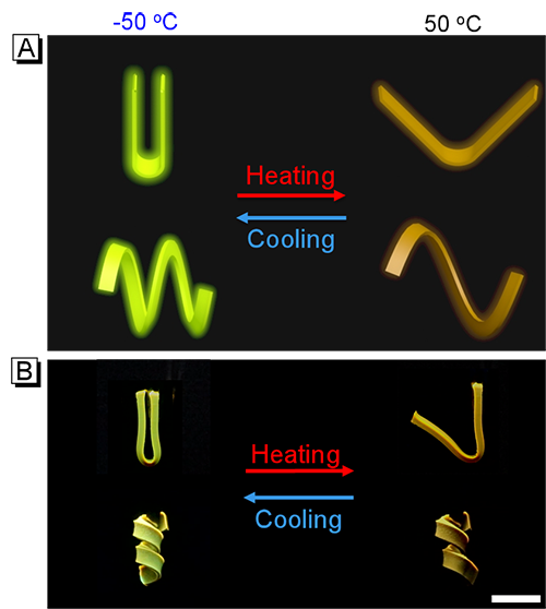 自然界中,許多物種在受到外部刺激時可以改變它們的顏色和形狀。例如,警報水母在受到攻擊時可迅速移動身體并發(fā)出一系列閃光。這些有趣的現(xiàn)象啟發(fā)了研究人員將這些功能遷移到智能領域,以制造更智能的器件,如傳感器、驅動器、軟體機器人和智能開關等。目前,科研人員已在水凝膠中實現(xiàn)了熒光顏色和形狀的同時變化。然而,水凝膠往往具有反應遲緩、形狀變化緩慢以及機械性能差等問題,限制了其在許多領域的應用。相比水凝膠,雙向可逆形狀記憶高分子(2W-SMPs)具有響應迅速、形變快速和機械性能良好等優(yōu)點。然而, 2W-SMPs是本體高分子材料,無任何溶劑存在,因此很難通過與水凝膠相似的方式實現(xiàn)熒光的改變。