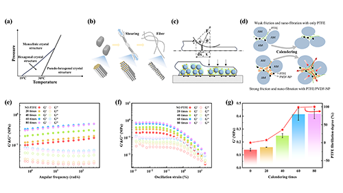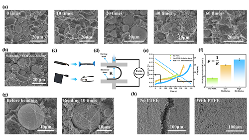 為了更好地控制電極加工過程中PTFE的纖維化,作者們通過對PTFE晶體結構以及成纖機理進行了研究(圖2)。根據PTFE的成纖機理,在電極制備過程中的漿料輥壓階段,漿料內部的活性顆粒、PVDF納米顆粒之間的相互摩擦可以使PTFE纖維化,因此,作者們可以通過控制輥壓次數來控制PTFE的纖維化程度,流變測試證明了PTFE的纖維化程度隨著輥壓次數的增加而增加,最終達到完全成纖。