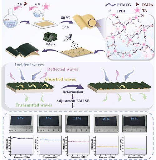 圖1 TAPU-MXene復(fù)合膜及其在不同固定變形條件下的可調(diào)EMI SE的制備路線示意圖