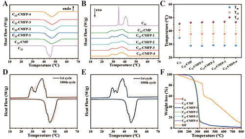 圖5. (A)C22和C22微膠囊的熔化過程和(B)凝固過程的DSC曲線;(C)C22和C22微膠囊的熔化溫度(Tm)和凝固溫度(Ts);(D)C22-CMF微膠囊和(E)C22-CMFP-4微膠囊的第1次(實(shí)線)和第100次(虛線)加熱/冷卻循環(huán)的DSC曲線;(F)C22、MF和C22微膠囊的TGA曲線。