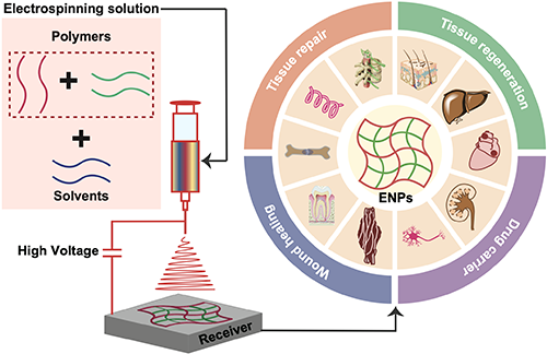 在生物醫(yī)學(xué)研究領(lǐng)域,開發(fā)具備生物降解性、生物相容性以及能夠模擬特定組織機(jī)械特性的支架材料,對于有效促進(jìn)組織修復(fù)至關(guān)重要。然而,損傷組織的微環(huán)境通常受到破壞,導(dǎo)致自然愈合過程受到顯著影響。此外,如何實現(xiàn)高效的新組織再生仍是亟待解決的重大挑戰(zhàn)。在此背景下,確保所使用材料的安全降解成為另一個必須克服的難題。靜電紡絲納米纖維平臺(ENPs)作為一種先進(jìn)的支架材料,主要由微納米纖維構(gòu)成,形成復(fù)雜的三維多孔結(jié)構(gòu)。這一獨特的結(jié)構(gòu)設(shè)計使得能夠精確調(diào)控支架的表面特性、內(nèi)部微觀結(jié)構(gòu)以及物理化學(xué)性質(zhì),從而顯著增強(qiáng)支架在組織修復(fù)和再生中的支持作用。更重要的是,ENPs能夠有效模擬天然細(xì)胞外基質(zhì),提供有利于細(xì)胞黏附、增殖和分化的微環(huán)境,這進(jìn)一步突顯了其在生物醫(yī)學(xué)應(yīng)用中的巨大潛力。因此,ENPs不僅在結(jié)構(gòu)上具備多樣性和可調(diào)性,而且在功能上能為組織修復(fù)提供全面支持,展現(xiàn)出廣泛的應(yīng)用前景。