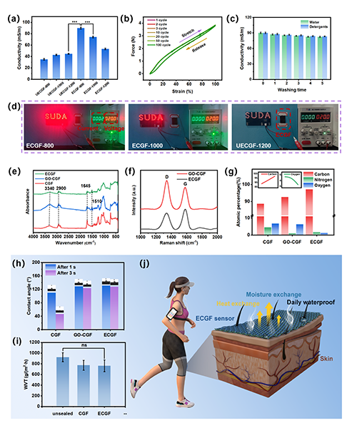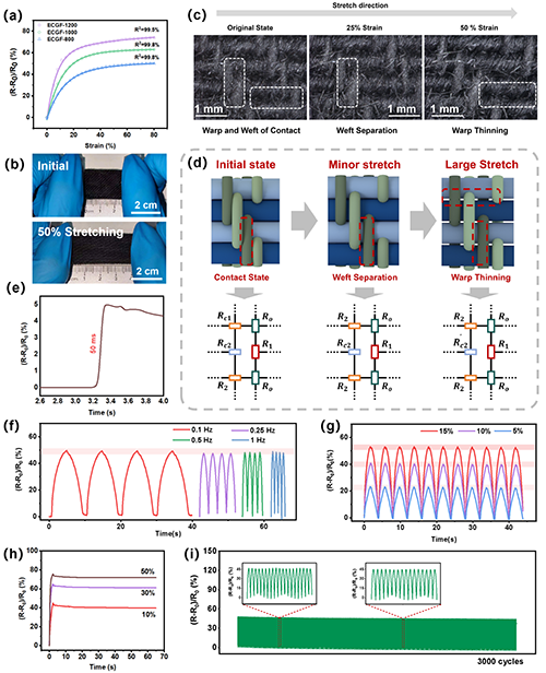 圖2. ECGF傳感器的力學(xué)、電學(xué)和穿戴舒適性表征