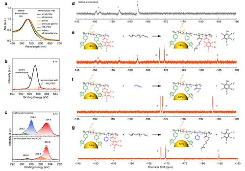 圖2. 共聚NHCs接枝AuNPs的表面氨解。(a)AuNPs@PPFPMA113-MNHC與各種氨基分子氨解的紫外-可見光譜。NH2-PEG氨解AuNPs@PPFPMA113-MNHC前后的(b)F 1s和(c)C 1s的XPS信號圖。(d)AuNPs@PPFPMA113-MNHC氨解前的19F NMR光譜以及用(e)NH2-PEG和(f)乙胺氨解的反應(yīng)和相應(yīng)的19F NMR光譜。(g)AuNPs@P(PFPMA-r-St)-b-PMNHC經(jīng)NH2-PEG氨解的反應(yīng)和相應(yīng)的19F NMR光譜。