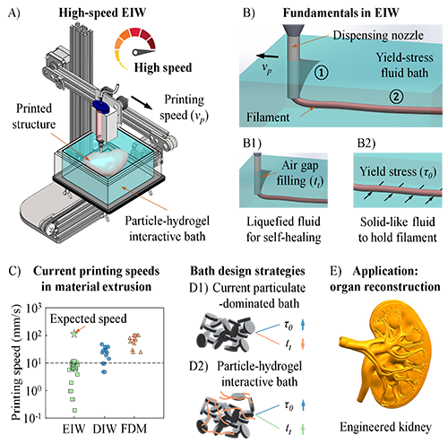 生物3D打印技術(shù)正逐步用于構(gòu)建功能性人體組織和器官模型。作為一種新興的生物3D打印策略,嵌入式墨水書(shū)寫(xiě)技術(shù)(Embedded Ink Writing,EIW)在器官打印領(lǐng)域展示出巨大的潛力。然而,受限于傳統(tǒng)EIW技術(shù)中支撐浴材料的流變學(xué)特性,最高打印速度始終難以突破10 mm/s的瓶頸,無(wú)法有效實(shí)現(xiàn)全尺寸組織器官模型的快速構(gòu)建。