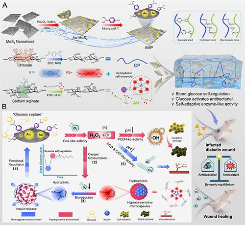 糖尿病在全球范圍內(nèi)影響著超過(guò)4.63億人的健康,而糖尿病足潰瘍作為其最嚴(yán)重的并發(fā)癥之一,直接導(dǎo)致了患者截肢率和死亡率的增加。糖尿病患者由于血糖調(diào)節(jié)機(jī)制的失效,常常面臨細(xì)菌感染、細(xì)胞氧化應(yīng)激和血管損傷等問(wèn)題,這些問(wèn)題共同作用導(dǎo)致慢性傷口愈合延遲。在糖尿病傷口的微環(huán)境中,活性氧(ROS)對(duì)抗菌治療至關(guān)重要,且控制在適當(dāng)?shù)臐舛确秶鷥?nèi)可以促進(jìn)血管生成和細(xì)胞外基質(zhì)重塑,但其過(guò)量產(chǎn)生又會(huì)導(dǎo)致修復(fù)過(guò)程細(xì)胞外基質(zhì)合成紊亂和細(xì)胞因子功能障礙,形成惡性循環(huán)。鑒于糖尿病傷口復(fù)雜的微環(huán)境,如何實(shí)現(xiàn)在創(chuàng)面感染階段產(chǎn)生ROS抗菌和修復(fù)階段選擇性清除ROS緩解氧化應(yīng)激的雙向調(diào)節(jié),在最大限度地提高糖尿病創(chuàng)面愈合速度和修復(fù)質(zhì)量方面極具挑戰(zhàn)性。