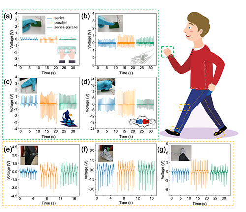 圖2 CNC基氣凝膠力電功能材料經(jīng)串聯(lián)、并聯(lián)和串并聯(lián)混合連接針對(duì)不同類型運(yùn)動(dòng)模式的輸出電壓:(a)手指敲擊、(b)拇指按壓、(c)手拍擊、(d)拳敲擊、(e)膝蓋彎曲、(f)腳踝旋轉(zhuǎn)、(g)踏步走.