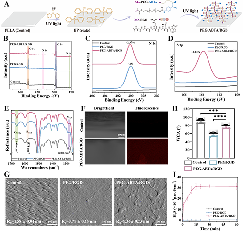 該研究通過二苯甲酮介導(dǎo)的兩步光引發(fā)聚合,在聚乳酸(PLLA)支架表面構(gòu)建了由硫醇觸發(fā)型H?S供體(ABTA)、聚乙二醇(PEG)和RGD多肽組成的聚合物分子刷涂層。涂層的理化性質(zhì)經(jīng)XPS、ATR-FTIR、熒光標(biāo)記、AFM、SEM和EDS等手段進(jìn)行了系統(tǒng)表征。亞甲基藍(lán)(MB)法證實(shí)該涂層可在谷胱甘肽(GSH)作用下釋放H?S。支架涂層釋放的H?S展現(xiàn)出多重生物調(diào)控功能。具體而言,H?S可提升血小板中cGMP水平并下調(diào)P選擇素表達(dá),從而抑制血小板黏附與活化,減少纖維蛋白原的結(jié)合,顯著增強(qiáng)涂層的抗血栓性能。同時(shí),H?S可清除活性氧(ROS),誘導(dǎo)巨噬細(xì)胞向具有組織修復(fù)功能的M2表型極化,促進(jìn)抗炎微環(huán)境的形成。在平滑肌細(xì)胞中,H?S誘導(dǎo)其轉(zhuǎn)變?yōu)槭湛s表型,抑制異常增殖與遷移,有助于維持血管的彈性與收縮功能;在內(nèi)皮細(xì)胞中,H?S上調(diào)促進(jìn)黏附、增殖與遷移的關(guān)鍵基因(如ITGA2、DUSP10和MICALL2),同時(shí)下調(diào)與不良重塑相關(guān)的基因(如MYL9和FSTL3),加速內(nèi)皮化并形成穩(wěn)定的內(nèi)皮覆蓋。該涂層通過對(duì)多種血管相關(guān)細(xì)胞行為的選擇性調(diào)節(jié),協(xié)同促進(jìn)血管穩(wěn)態(tài)與功能修復(fù),有效抑制再狹窄的發(fā)生,顯著提升支架的長(zhǎng)期療效。