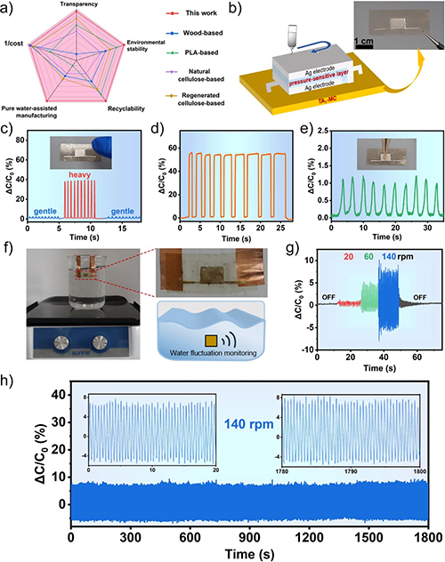 近期,吉林大學(xué)孫俊奇教授、李懿軒副教授團(tuán)隊(duì)通過將甲基纖維素(MC)和單寧酸(TA)在水溶液中的復(fù)合,然后將得到的聚合物沉淀進(jìn)行熱壓,制備出了高環(huán)境穩(wěn)定性、可循環(huán)利用與可降解的可逆交聯(lián)水塑料(TA-MC),并用于制備高性能FPCBs(圖1和圖2a)。樹枝狀單寧酸可通過高密度氫鍵將甲基纖維素鏈段限制在原位形成的TA-MC納米限域相中(圖2b和2c)。一方面,TA-MC納米限域相具有致密、剛性和疏水性,可提升水塑性材料的力學(xué)性能與環(huán)境穩(wěn)定性;另一方面,氫鍵交聯(lián)的納米限域相可在特定條件下動態(tài)解離,促進(jìn)水塑料的解聚與降解。因此,由于動態(tài)納米限域相的存在,TA-MC水塑料在干燥狀態(tài)下的斷裂強(qiáng)度高達(dá)109.6 MPa,且在180 ℃下儲能模量可達(dá)2.85 GPa(圖3a和3b)。在室溫下浸泡入水中15天后,其具有40.4 MPa的斷裂強(qiáng)度,展現(xiàn)了優(yōu)異的耐水性。即使在80 ℃熱水中,TA-MC水塑料的斷裂強(qiáng)度仍然可達(dá)34.2 MPa(圖3e)。源于氫鍵交聯(lián)網(wǎng)絡(luò)以及納米限域相的可逆性,TA-MC水塑料在吸水后,可以通過熱壓(80 ℃)的方式進(jìn)行多次加工與循環(huán)利用(圖4)。由于TA-MC水塑料優(yōu)異的力學(xué)性能和耐水性,由TA-MC基板和3D打印傳感元件組成的高性能FPCBs可作為電容式傳感器,用于水下探測(圖5)。該FPCBs展現(xiàn)了出色的靈敏度、可靠性和耐用性。更重要的是,通過將TA-MC基板溶解在無害的醫(yī)用酒精中,電子元件可以很容易地從FPCBs中分離出來(圖6)。同時,由于殘留的聚合物基板可以在土壤中降解成無毒物質(zhì),其可以安全地丟棄而造成環(huán)境污染。