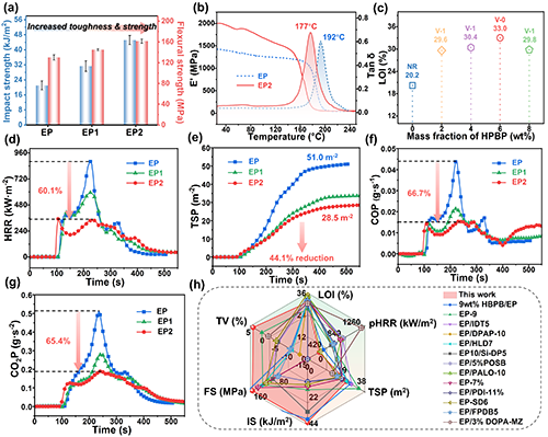 圖3. EP、EP1和EP2的力學性能、阻燃性能及與已報道環(huán)氧樹脂綜合性能對比