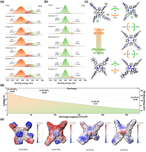 采用非原位光譜表征和理論計算(圖6),作者進一步探究了PPCMP-Cu高活性位點和雙極性儲能特性。在高電壓區(qū)間,卟啉環(huán)與吡咯環(huán)可以通過P型氧化還原反應結(jié)合陰離子。在低電壓區(qū)間,卟啉環(huán)中心C=N可實現(xiàn)陽離子的可逆存儲。在完整的充放電過程中,PPCMP-Cu的儲能單元Cu-PP可實現(xiàn)共10個離子的可逆儲能,從而實現(xiàn)286.2 mAh g?1的高理論容量;DFT理論計算結(jié)果,作者進一步探究離子在Cu-PP單元上的儲能行為。其中,Cu2+優(yōu)化卟啉環(huán)中心電子云結(jié)構(gòu),實現(xiàn)2個陰離子與4個陽離子的可逆存儲。并且在充電過程中,隨著卟啉及吡咯基團共結(jié)合6個陰離子后,Cu-PP單元MESP圖呈現(xiàn)趨向于電中性的形態(tài),同時在放電過程中卟啉中心結(jié)合4個陽離子后Cu-PP單元實現(xiàn)飽和。證實Cu2+的配位可提升離子存儲數(shù)量,使PPCMP-Cu展現(xiàn)出更高的比容量和能量密度。
