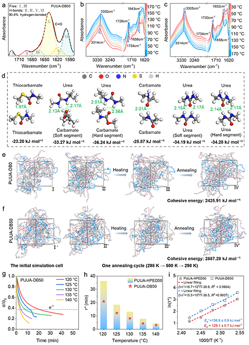 圖2. PUUA-DBs中多重動(dòng)態(tài)鍵的熱可逆性及其化學(xué)模擬分析:(a)PUUA-DB50中C=O伸縮振動(dòng)區(qū)域FTIR光譜的峰分離擬合圖;(b, c)PUUA-DB50的變溫紅外光譜圖;(d)通過量子化學(xué)計(jì)算得到的不同類型氫鍵的相互作用能(?EH)及其對應(yīng)的鍵長(L); (e) PUUA-DB0 和 (f) PUUA-DB50 彈性體在模擬單元中的平衡構(gòu)象(Ⅰ,Ⅰ′),以及在一個(gè)退火循環(huán)中的構(gòu)象變化過程,包括從 298 K 線性升溫至 500 K 的加熱過程(Ⅱ / Ⅱ′ → Ⅲ / Ⅲ′)和從 500 K 線性降溫至 298 K 的冷卻過程(Ⅲ / Ⅲ′ → Ⅳ / Ⅳ′)。靛藍(lán)色線條表示 PA1212 片段,灰色、紅色、藍(lán)色、黃色和白色線條分別表示碳、氧、氮、硫和氫原子; (g) PUUA-DB50 的歸一化應(yīng)力-時(shí)間曲線;(h) PUUA-HPED50 和 PUUA-DB50 在不同溫度下的特征松弛時(shí)間(τ);(i) PUUA-HPED50 和 PUUA-DB50 的特征松弛時(shí)間 τ 與溫度倒數(shù) T 的關(guān)系曲線及其 Arrhenius 方程擬合線。