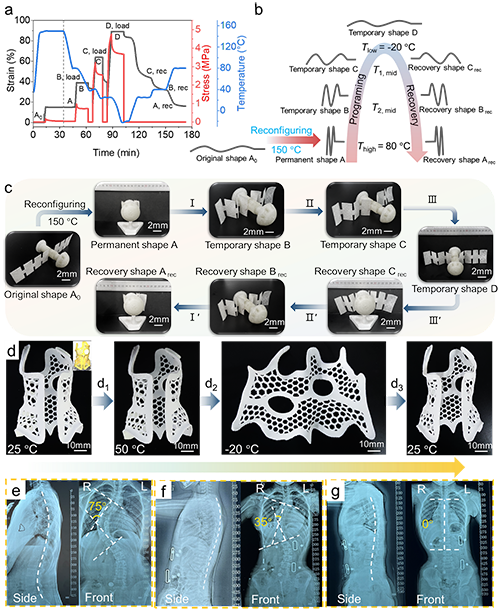 圖6. 多重形狀記憶PUUA-DB50的可重構(gòu)4D打印及其在脊柱矯形器中的應(yīng)用: (a) 90°構(gòu)型下4D打印PUUA-DB50薄膜永久形狀的可重構(gòu)性及其四重形狀記憶曲線; (b) 四重形狀記憶的形變、固定與恢復(fù)過程示意圖; (c) PUUA-DB50打印航空航天結(jié)構(gòu)的四重形狀記憶宏觀演示(Ⅰ:在80 ℃變形并于40 ℃固定;Ⅱ:在40 ℃變形并于25 ℃固定;Ⅲ:在25 ℃變形并于?20 ℃固定;Ⅲ'''':加熱至25 ℃;Ⅱ'''':加熱至40 ℃;Ⅰ'''':加熱至80 ℃); (d) 脊柱矯形器的雙重形狀記憶(插圖:脊柱矯形器模型的數(shù)字文件)(d1:50 ℃編程;d2:?20 ℃固定(脊柱矯形器在50 ℃被彎曲至180°臨時(shí)形狀,冷卻至?20 ℃,保持30分鐘后移除外力,臨時(shí)形狀被固定);d3:加熱至25 ℃); (e-g) 志愿者佩戴4D打印脊柱矯形器不同護(hù)理階段的雙側(cè)及正面在矯片X光片(Cobb角度由75°減至35°再至0°)