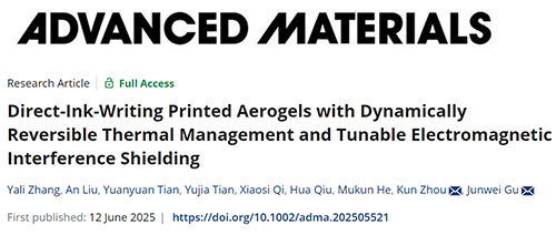 Yali Zhang, An Liu, Yuanyuan Tian, Yujia Tian, Xiaosi Qi, Hua Qiu, Mukun He, Kun Zhou* and Junwei Gu*. Direct Ink Writing–Printed Aerogels with Dynamically Reversible Thermal Management and Tunable Electromagnetic Interference Shielding. Advanced Materials, 2025, 10.1002/adma.202505521.