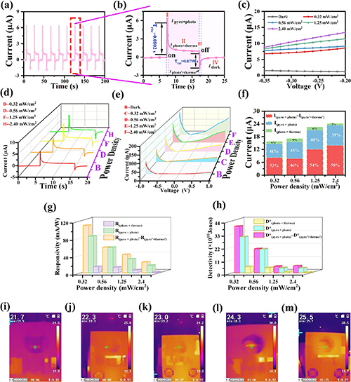圖2. 在0.32 mw/cm2紫外光強(qiáng)度(365 nm)下,(a)TiO2 NRs/BiOCl//PEDOS的電流-時(shí)間(I-T)曲線;(b)局部放大的I-T曲線;(c)電流-電壓(I-V)曲線;(e)塔菲爾曲線;不同紫外光強(qiáng)度與(f)電流,(g)響應(yīng)度,(h)探測度的關(guān)系;(i-m)不同紫外光密度下UV PD的溫度變化