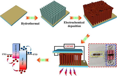 導(dǎo)電聚合物(如聚(3,4-乙撐二氧硒吩)(PEDOS)、聚(3,4-乙撐二氧噻吩)(PEDOT)),憑借其快速的空穴遷移速率,出色的紫外光吸收能力和高穩(wěn)定性,被廣泛應(yīng)用于能量轉(zhuǎn)換和儲(chǔ)能領(lǐng)域。其中PEDOS具有良好的氧化還原特性和光學(xué)特性,其光學(xué)帶隙為1.4eV,這主要是得益于硒原子具有優(yōu)異的極化性和較高的載流子遷移率。P(TTh-co-EDOT)是一種由三噻吩(TTh)和EDOT組成的共聚物,兼具優(yōu)異的光吸收性能和電導(dǎo)率。利用上述導(dǎo)電聚合物改性TiO2納米陣列構(gòu)建p-n異質(zhì)結(jié),能夠實(shí)現(xiàn)無外偏壓條件下的優(yōu)異光電性能,為高性能自供電紫外光探測器的開發(fā)提供了有機(jī)-無機(jī)雜化異質(zhì)結(jié)的創(chuàng)新方案。