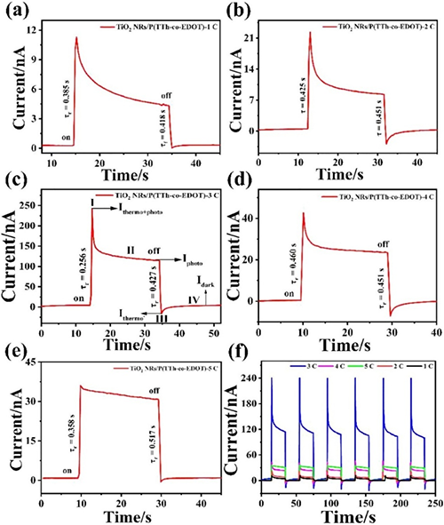 圖4. TiO2 NRs/P(TTh-co-EDOT) 共聚物異質(zhì)結(jié)在不同沉積周期下的I-T曲線。(a)1C;(b)2 C;(c)3C;(d)4C;(e)5C;(f)不同沉積周期下的I-T曲線。