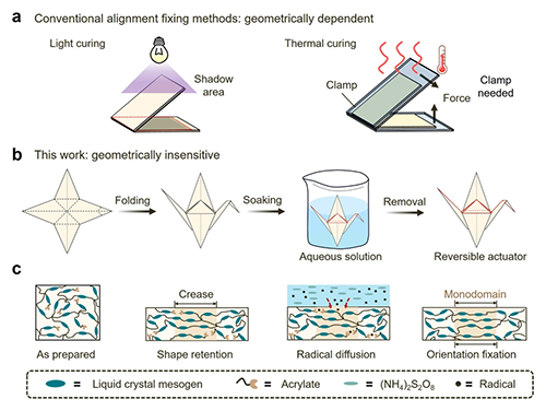 研究團隊發(fā)現(xiàn),只需將液晶彈性體在室溫下浸泡于含過硫酸銨(APS)的水溶液中,APS生成的硫酸根自由基便可全方位滲透到材料內(nèi)部,與殘留的丙烯酸基團發(fā)生化學(xué)交聯(lián),從而固定分子取向。這一過程無需加熱、光照或外力固定,且材料本身的疏水性防止了水致膨脹,保證了復(fù)雜變形結(jié)構(gòu)在編程過程中的穩(wěn)定性。實驗表明,該方法適用于3D打印、模壓、浮雕甚至折紙結(jié)構(gòu)的液晶彈性體,并能在幾小時內(nèi)完成高效取向固定。