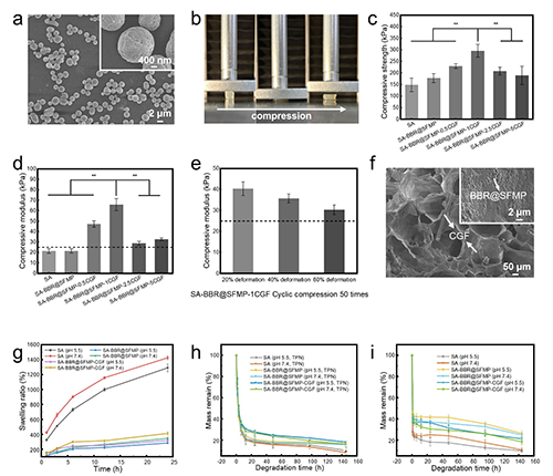 圖2. SA-BBR@SFMP-CGF復(fù)合水凝膠的表征、力學(xué)性能及降解行為:(a) 載藥后BBR@1%SFMP表面形貌;(b) 壓縮過程圖像;(c) 復(fù)合水凝膠壓縮強度;(d) 復(fù)合水凝膠壓縮模量;(e) SA-BBR@SFMP-CGF在20%、40%、60%應(yīng)變下50次循環(huán)后的壓縮模量;(f) SA-BBR@SFMP-CGF表面形貌;(g) SA, SA-BBR@SFMP, SA-BBR@SFMP-CGF在不同pH下的溶脹率;(h) SA, SA-BBR@SFMP, SA-BBR@SFMP-CGF水凝膠在含胰酶的PBS降解液中的質(zhì)量保留率;(i) 在PBS降解液中的質(zhì)量保留率。